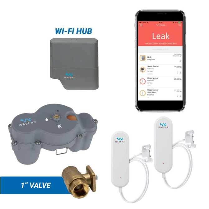 The Wasens RSC-900-AW is a wireless plumbing leak detection and automatic water shut-off system with app-based notifications and control. It also monitors for near-freezing temperatures that could cause burst pipes. This kit includes the following commercial-grade components: